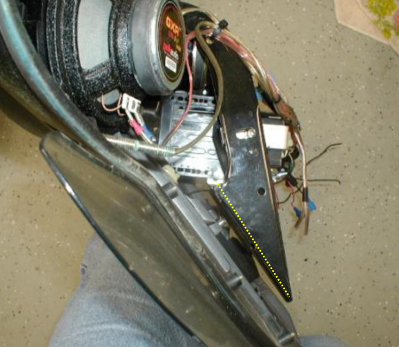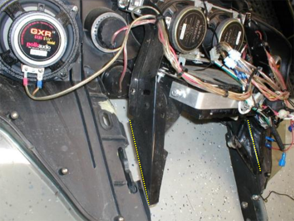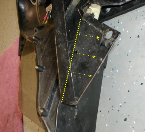 The yellow dotted lines show where the bottom of the HD brackets were bent inward to form a mounting surface which