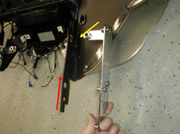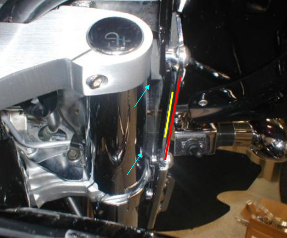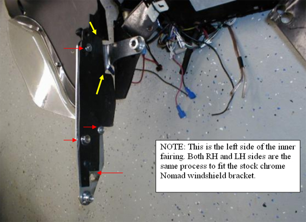 ways. They force the inner fairing lower legs (yellow) out into the chrome stock Nomad windshield bracket (red).