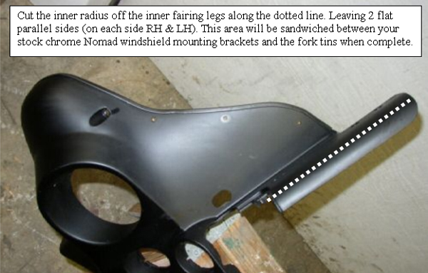 On the HD inner fairing, cut along the dotted line as shown above. This will leave you with two flat sides that will line up down the outer edges of your front fork tins. Now bolt the outer fairing to the inner fairing and sat the whole assembly up on top of the Nomad sliding the two inner fairing flats down alongside the Nomad forks