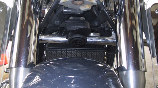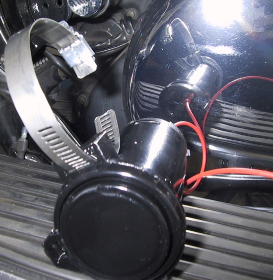 8. Now, mount the horn portion of your assembly. The Stebel is extremely compact. The photo at right shows it mounted to the front of the engine protector bar using another hose clamp. It's very hard to see but that's the point. I want it to be heard not seen. If you have another brand of horn mount it/them wherever the assembly pleases your eye. If you mount the horn above your front fender make sure there is plenty of clearance when the forks are completely compressed (fenders are expensive).