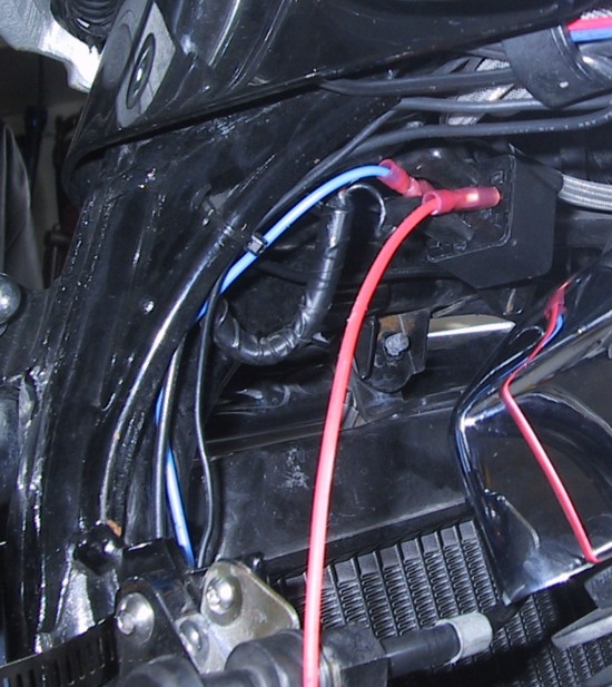 2. Use the horn mounting location (and stock mounting bracket bolt) to attach your relay where the horn 'was' mounted. Note in the photo (right) I've attached a blue and a red wire to the relay