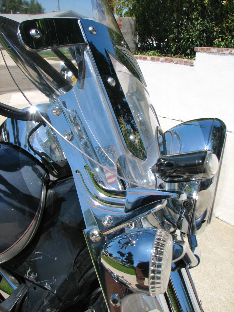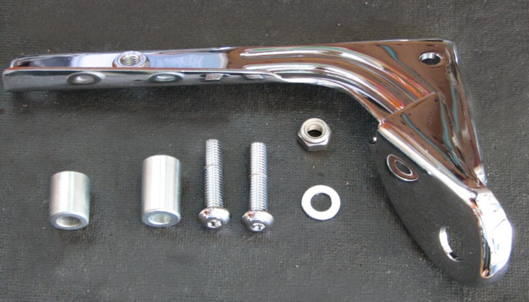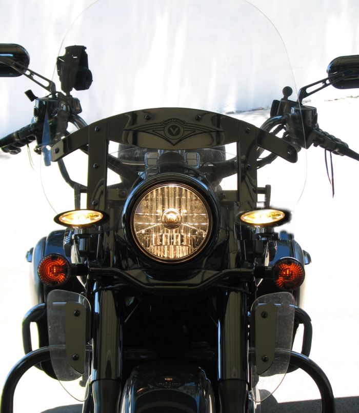 Here's another option to spending $200 or more on a light bar. All the parts (excluding lights) cost about $40, slightly higher if you use chrome bolts. Ok, it's a little more costly than Kirk's but without the risk and still a lot less expensive than a commercial bar. It only involves a bracket from Drag Specialties, a couple of bolts and spacers and....well, there is no and. That's it! One small caveat. This will only work for those who ride with the Nomad windshield all the way up. Any lower than top of the adjustment and you'll have a collision between the light mounting tabs and the bottom of your shield.