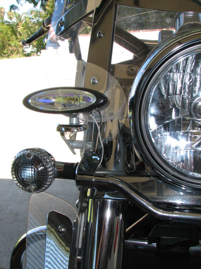 1- Set of spotlights. Typical Harley style come from Drag Specialties, Cobra or other 5" spotlights (preferably with H3 bulbs for easy replacement) cost, somewhere around $65 for a pair but can go higher if you want fancy lenses. If you enjoy scrounging around motorcycle salvage yards you can probably pick up a nice set of spots for $10 or so.