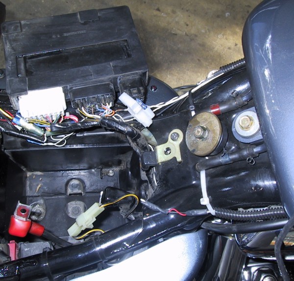 1. Remove the battery. On FI bikes it's much easier to get the battery out if you first remove the ECU. With the cables removed from your battery and the ECU hanging (carefully) by its cables lift the battery out. You'll be left with a plastic box. How grungy is it in there? Any bugs? Spiders homes? Now's the time to clean everything out and start fresh.