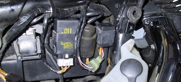 7. Remove two small bolts holding the overflow bottle in place and you'll see a line of relays.Lift each of the relays off its post, unplug the connector and clean connections. Note the variety of connectors Kawasaki has used. There's no way you'll be able to mix up what connector goes to what relay.