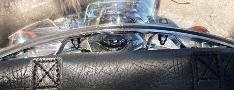 Check out Bob's solution. He made a bracket from stainless steel that attaches to the windshield using the stock bolts. The bag is riveted to the frame.