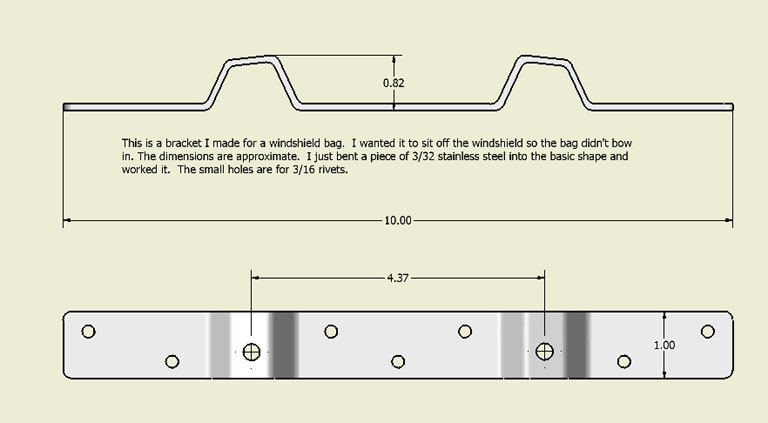 2. Take the pattern to your workshop and check the dimensions against your own windshield bolts. If it's pretty close then make a pattern from cardboard (this is why you save those old shoeboxes) and make some test bends and holes. Work with cardboard and your choice of bag until you have everything juuuuust right. The bag should be supported but not hitting anything.