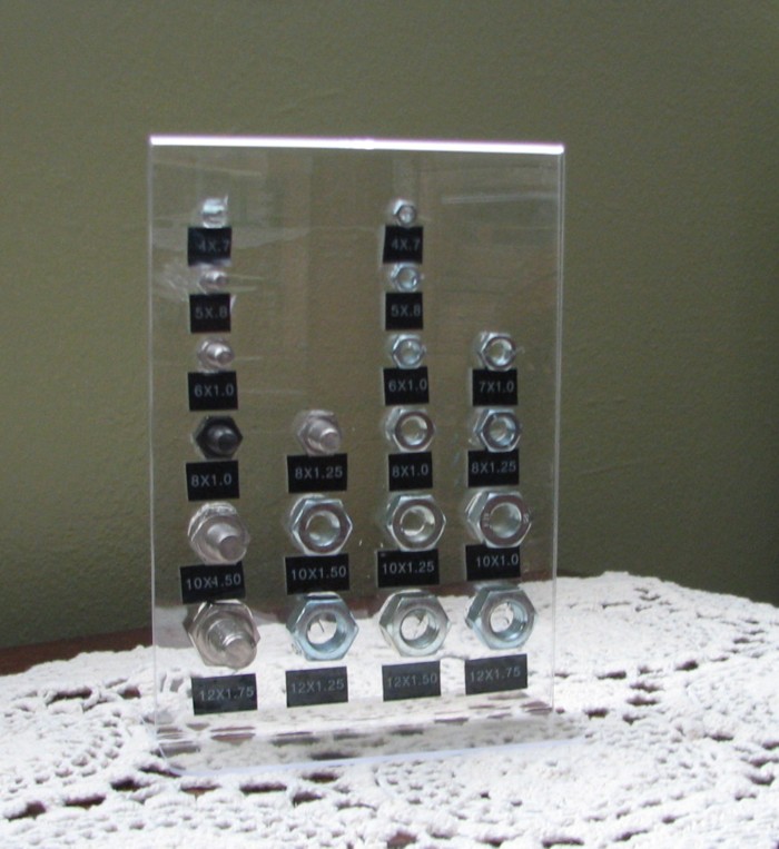 Now when you want to know the size of a nut or bolt you can just try to spin it onto your display and head for the hardware store knowing you'll come home with the right size to fit your project.