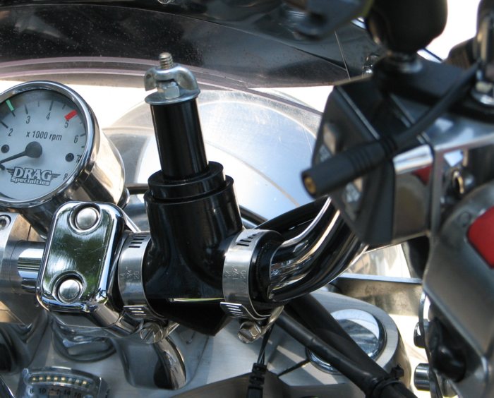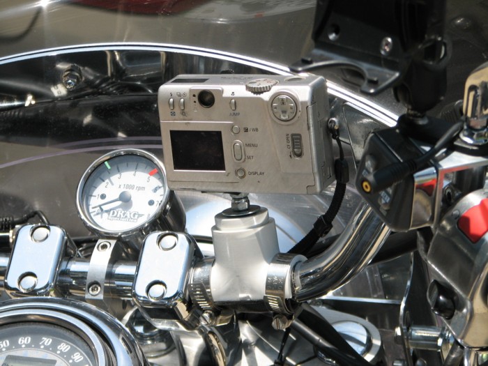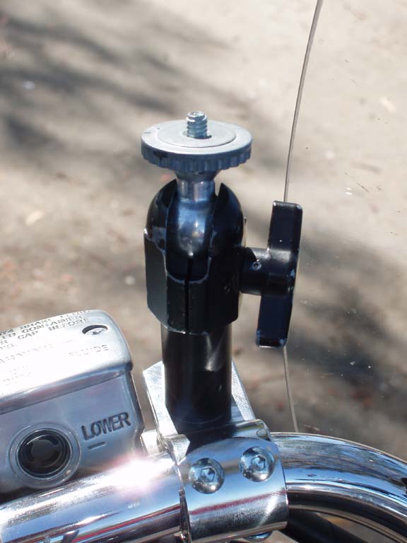 The picture (right) is Bob's installation. Notice his camera is held just outboard of the windshield for a clear view of the road ahead. Some riders might prefer to protect their lens from road hazards by tucking it behind the shield.