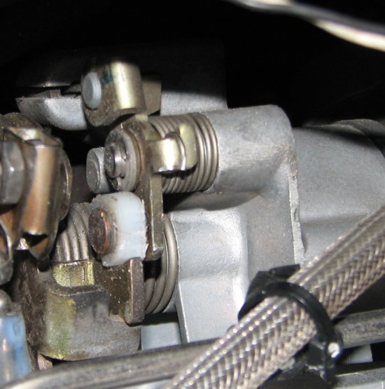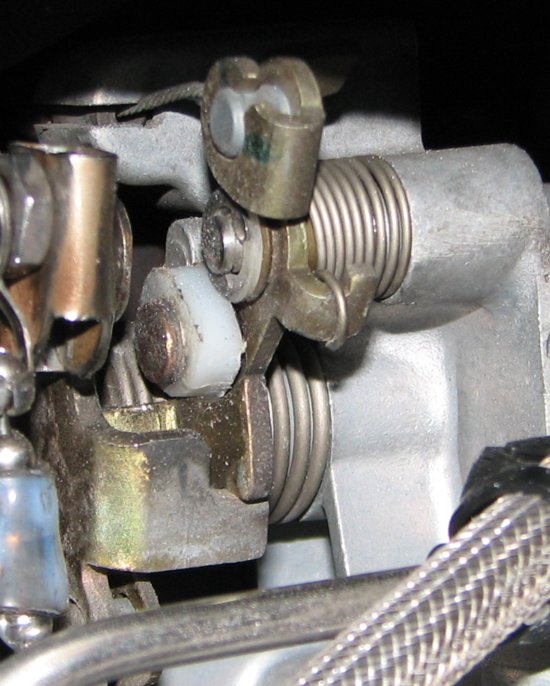 Notice how the nylon spacer is pushing down on the lever holding the throttle open just slightly. You can tune the cold idle rpm by sanding or filing more or less from the bottom of the spacer.
