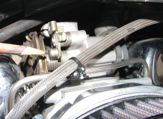 Is so simple. It only requires 1/4" of 9/32" vacuum hose. You can buy some of this from the local auto parts store or....take a look under your bike. See the vent/drain hoses hanging just in front of the rear tire? Snip 1/4" from any one of them.