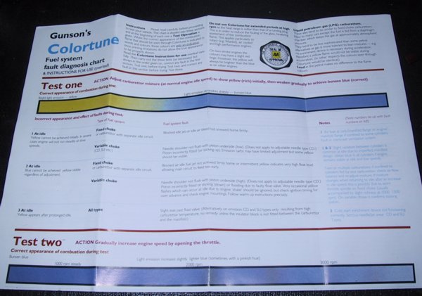 By looking into the combustion chamber through the Colortune we can get a good indication of the mixture under most operating conditions. The flame color shows that four fairly distinct stages occur. when the flame color is blue/white, the mixture ratio is between 16 and 14:1; a blue color indicates a mixture between 14 and 12,5:1; a blue/orange color indicates 12,5 to 11:1 and orange indicates 11:1 or less.