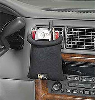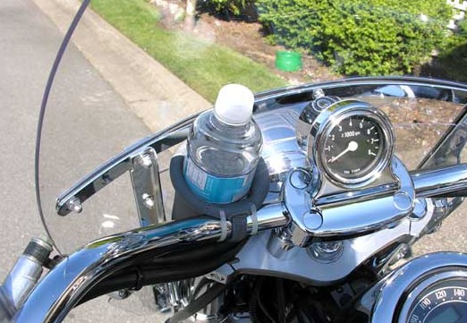 Like Jax, Ron is one of those people who can look at a product sold for one purpose and his mind adapts it to another. So it is with an item that can be found in nearly any department, auto supply or electronics store, even E-Bay. It's the Case Logic "automotive catchall". The product is marketed to hold anything from cell phones to trash. Ron thought it would make a mighty nice drink holder on his bike. The product is covered in soft Neoprene so won't scratch your chrome or paint. It just happens to be the right size for a typical bottle of water or soda can.