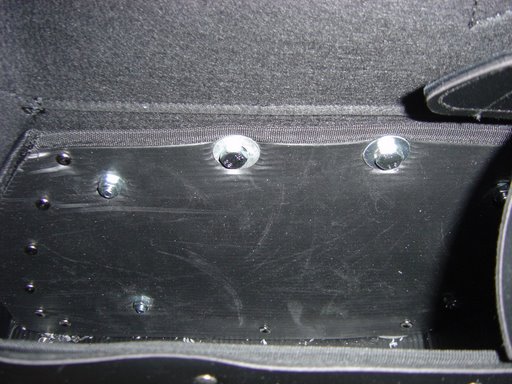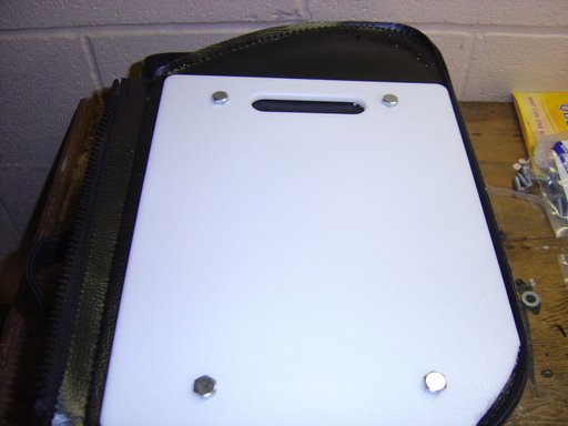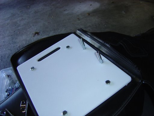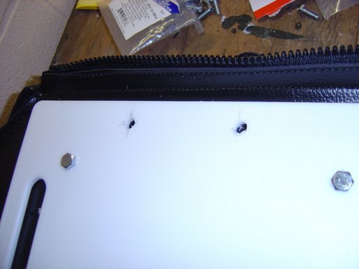 1. Remove whatever strap or panel is attached to your saddlebags attaching the two for throwing over the back seat. Lay your saddlebags down and place the cutting board on the back. Mark the cutting board to match any curvatures or angles on the bags as shown at right. Remove the excess plastic using a bandsaw or cutting wheel. Mark plastic for and drill four holes in the plastic and bags. Make sure the bolts that will be on top are low enough so they won't interfere with the fender trim you'll be attaching the plastic to. Attach plastic to bag using four bolts (length depends on the thickness of your saddlebag) using washers on the inside to avoid tearing the leather when bags are loaded.