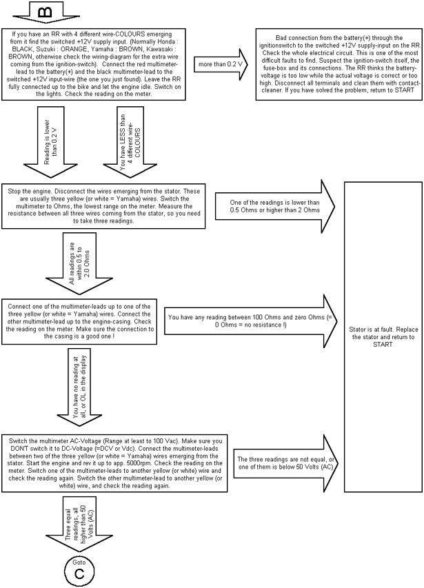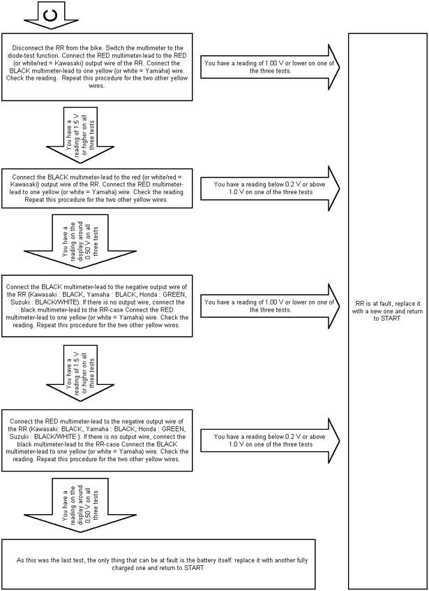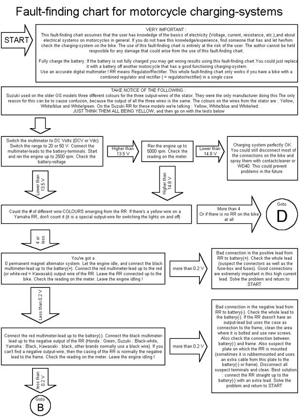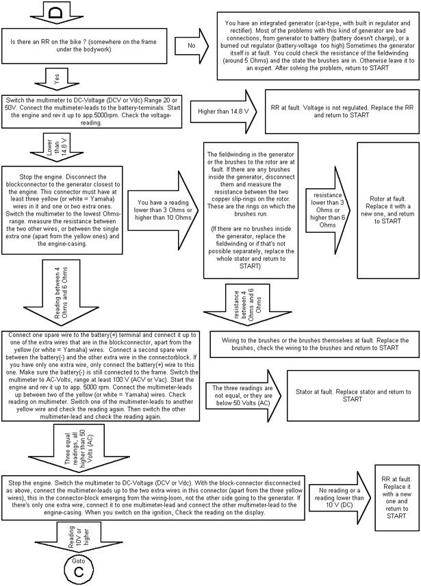 The following chart is provided by Electrex USA which sells replacement stators (alternators) Rotors and Voltage Regulators for motorcycles.
