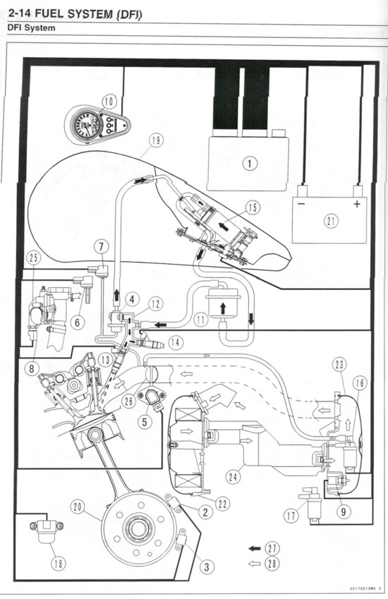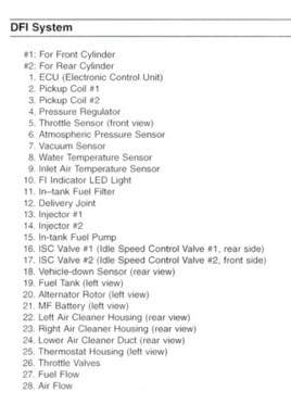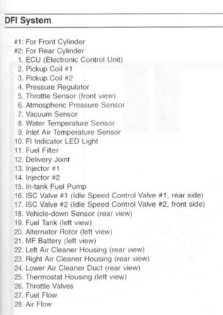 Note how everything ties into the ECU (#1) from engine timing to coolant temperature, altitude sensor and throttle position sensor to the (hope you never have to use it) tip over switch. Fortunately the system is pretty robust and causes very little in the way of trouble.