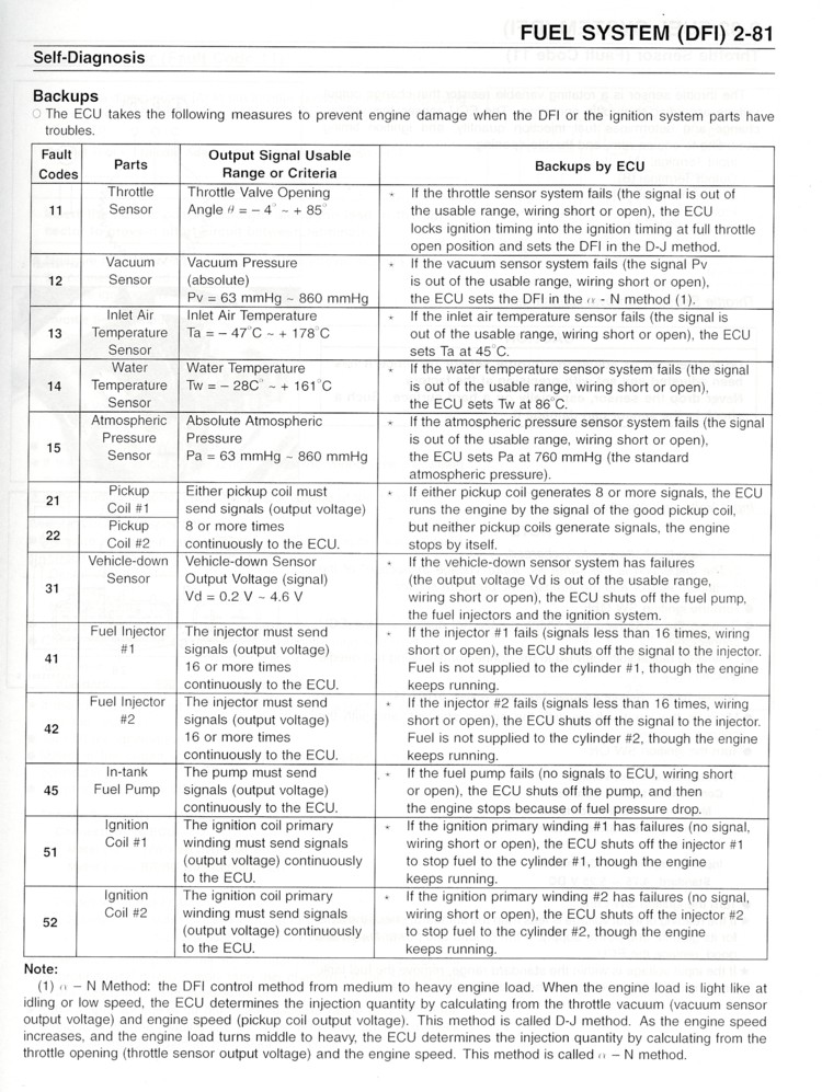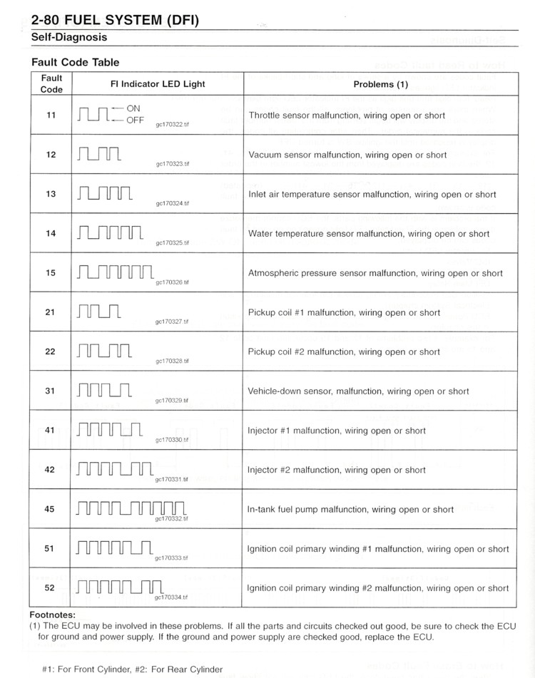 5. Locate the problem with the fault code table (see below) and check and repair DFI or ignition system according to the description adjacent to the code