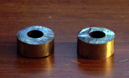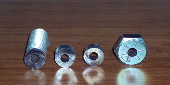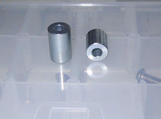 [Gadget Note: Take a look at the photos and note Johnny only had to drill through the top and non threaded portion of the bolt. You can probably do that with a hand drill and vice. If you have a decent hardware store in your area (not Lowes or Home Depot) you should be able to purchase stainless steel spacers that look like this. They are available in a wide range of sizes and lengths.]