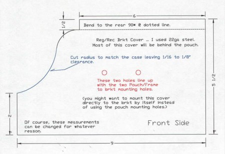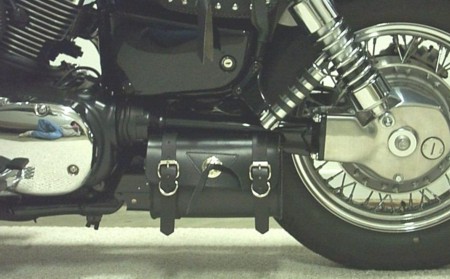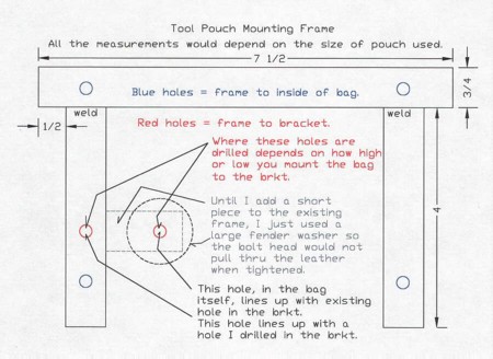 To hang a storage pouch: Make a 3 sided frame (Frame Plans Here) from 3/4" wide 16ga steel that mounts on the inside of the bag...then that bolts to the bracket which also hides the open space not covered by the bag. (Bracket Cover Plans Here) Be sure not to interfere with the side stand. And make sure it is out away from the drive shaft enough to clear it.