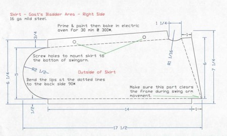 To cover the "Goat Gap" on the right side of the bike: Make a 'skirt' (Plans Here) from 16ga steel that bolts to two drilled/tapped holes in the bottom of the swing arm. Make sure it clears the rear part of the frame...since it moves with the swing arm. Paint to match.