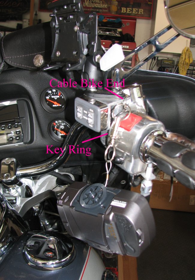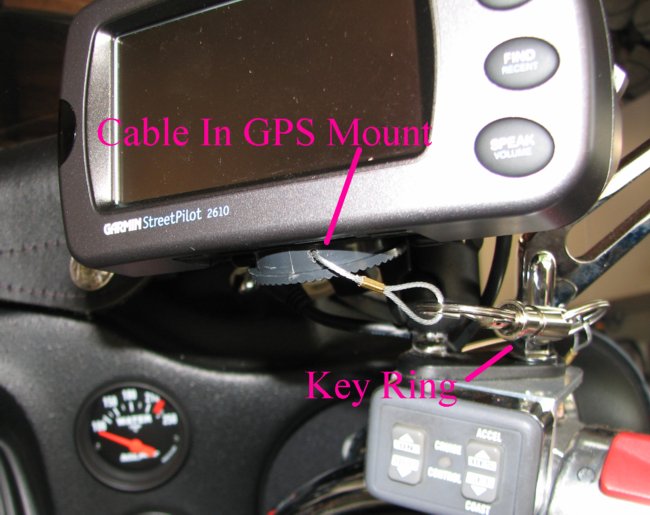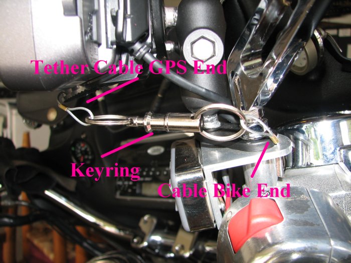 At this point you should have the GPS mounted in its normal position on the bike and the quick release key ring attached to both loops so you can determine how long your second piece of cable needs to be. (make sure you have the side that's simpler to release facing toward the rider).