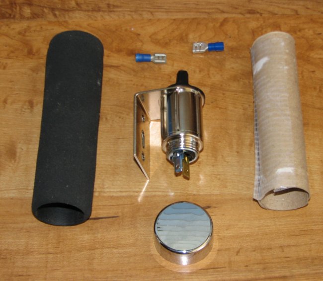1- Weather resistant accessory connector. The one shown above is Casco #216481C from Wal-Mart, about $3. It's heavy duty and includes a very nice chromed mounting bracket.