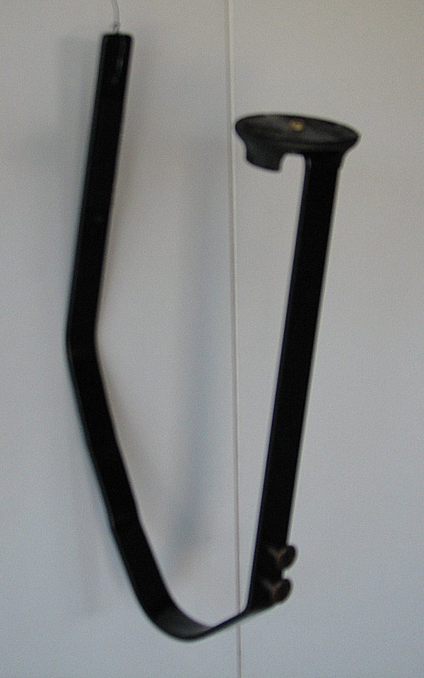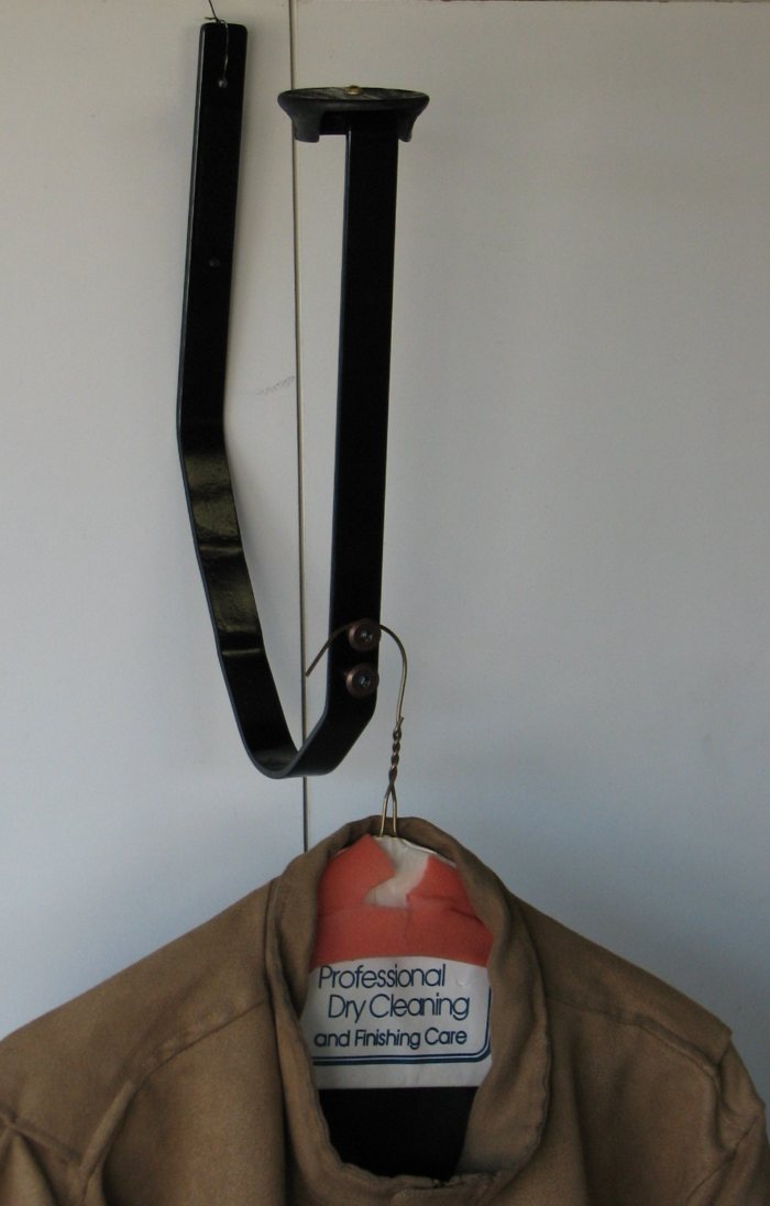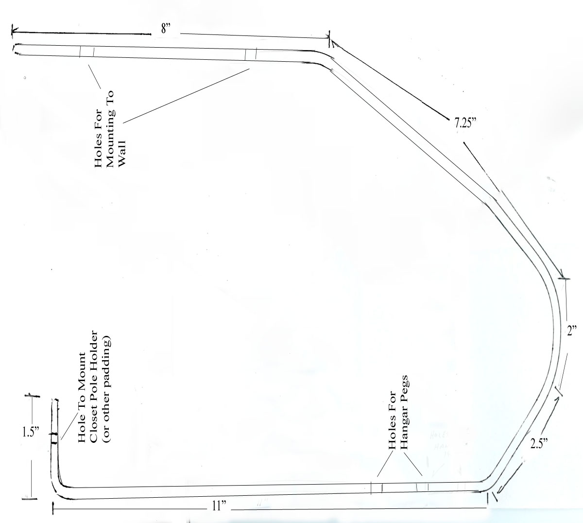 The dimensions are what I ended up with but you'll probably want to make adjustments for the depth of your helmet, where you want to locate the coat hangar and distance you need from the wall so the back of your helmet isn't hitting the rack and other factors. Maybe you've looked at the picture and thought that much of the rack doesn't have to show below the helmet. Make an adjustment to fit your style/needs. I suggest you use a strip of cardboard formed to fit the pattern or print the drawing as close to scale as you can (it needs two sheets of paper) and lay your helmet on the drawing. Adjust as necessary then transfer the measurements to your flatstock. It'll save a lot of heating and bending, trust me on that one <g>.