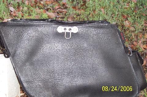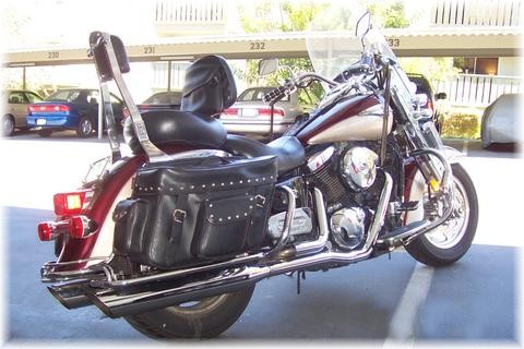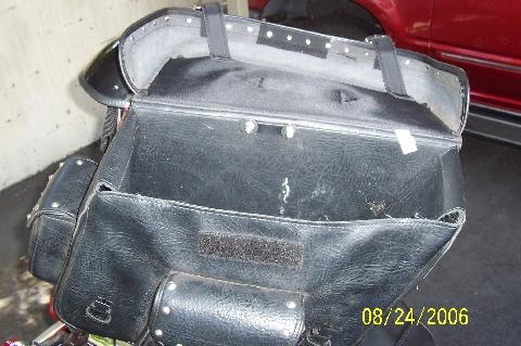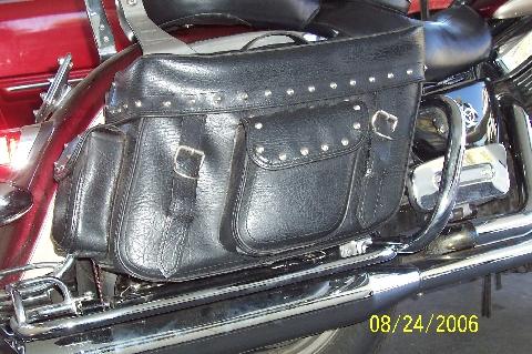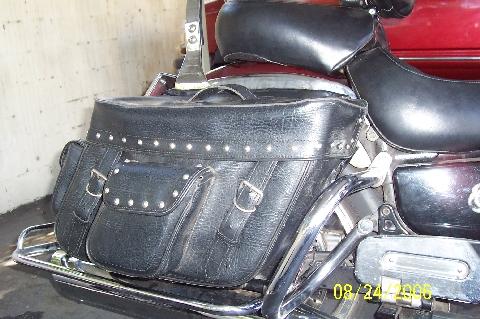 1 - Set of saddlebags. /files/includes/images/huntbagrs1.jpg (46204 bytes) The ones shown here /files/includes/images/huntbagrsf2.jpg (38835 bytes) are "XL Slant River Road" (studded) from Chaparral Motorsports.   Part 310-8940 for non zipper ($143.99) or 310-8964 for zip-off ($158.99)  These are leather 'like' material which tends to hold shape and wear better than real leather.