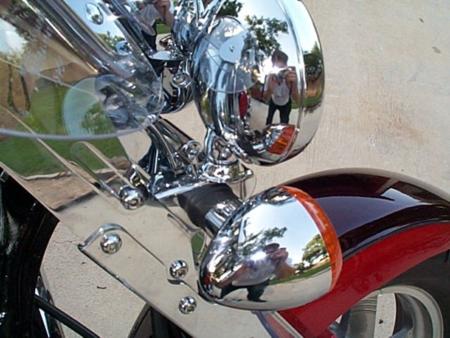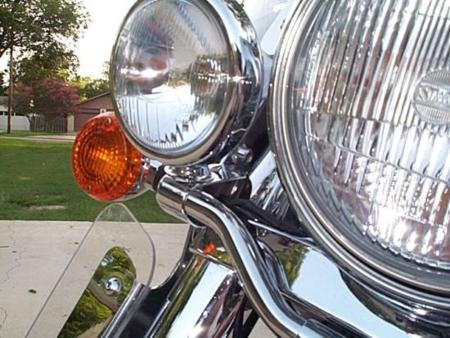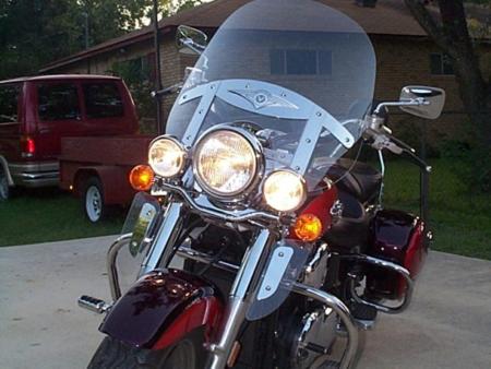 For all my fellow Nomaders, Last night I installed some spot lights on my Nomad. I didn't much feel like paying $200 for a light bar and spots, and I figured the Nomad already HAS a light bar that the signals lights are attached to. So I bought a pair of Show Chrome 4-1/2 inch spot lights and installed them on the existing light bar. I bought the spots from Frankie at Wing Things for about $35 each. It was a fairly simple job, and took only about 1.5 hrs. Most importantly, it looks good. And I saved a load of money. I wired them so that the light stay on in both high and low beam. And they're bright, at 55 watts each they look just as bright as the high beam.