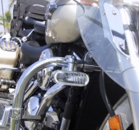 through the hollow center of the mounting bolt.Check out the photos (below) for other front lighting options on your Nomad. Some owners have mounted them on top of the engine guard bars, others at the bottom.