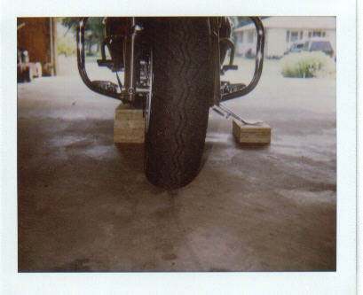 By R. MurphyI Came up with a way to check the oil with the bike level without worrying about it tipping or needing a helper. Had some scraps of 3/4" and 1/4" plywood. Cut them into 6" X 10" pieces. Stacked them up and screwed them together to make two blocks. One 2 3/4" high, the other 6 1/2" high. I put the taller one under the frame on the right hand side of the bike and put the other on the floor next to the sidestand. I sit on the bike, lean it to the right, and push the shorter block under the sidestand. Your bike is now level and secure. Note photo below. From the camera angle the bike looks off center, but it is actually level.