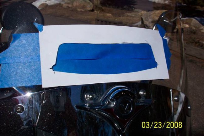 2. The SPOOKY part: Remove the template and drill the four corners with drill bits of the same radius as the template corners (keep the drill 'inside' the lines). You might find the top corners are larger radius than the bottom two so choose your bits accordingly. IMPORTANT: Use a drill bit made for drilling plastic and go slow, letting the tool do the work or you risk cracking the windshield.
