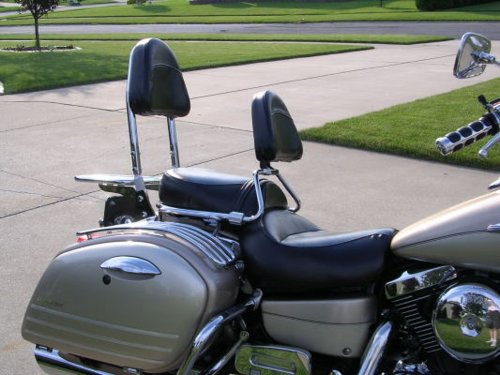 Get two pieces of one foot long square steel stock and insert one piece per leg of the backrest bar to the depth of 6 inches. When the pieces are inserted, drill, using the stock bolt holes as a template and then bolt the bar into the backrest bar. Then drill two holes at the bottom of the steel stock to match up with your backrest support plate holes and bolt the whole thing to the bike.