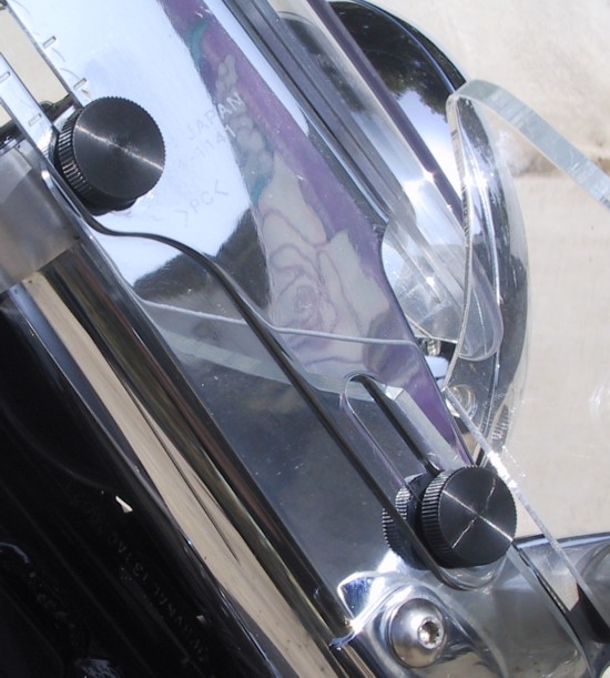 As above just press the cap screws into the thumbscrews and replace your original parts with them. Now you can remove the windshield in less time than it used to take you to find the 5 mm Allen wrench.But you don't want a black plastic knob hanging out there where everyone can see it right next to those lovely chrome windshield mounts. No problem. Check out the McMaster Carr Catalog pages 2000 and 2002 where you'll find the thumbscrews in aluminum and stainless steel. Be warned, they are 'not' 15 cents each.