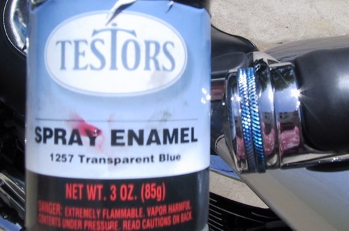 outside end (held in place by four little bolts which also hold the end cap on). Kuryakyn sells tinted rings which you can add to the collection. Over time the tinted rings fade but there's no reason to purchase new. Just get yourself a can of Testors 'Transparent" paint (any hobby shop or most stores where plastic models are sold) and spray the rings (including the O.E. chrome one) in your choice of color. It helps to run a piece of wire through the rings and spray them while supported by the wire rather than laying them flat.