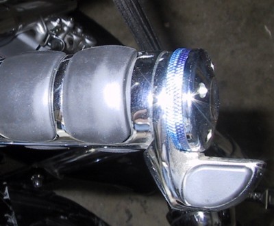 Many riders with Kuryakyn grips have also installed the "Throttle Boss" which helps hold the throttle open allowing the rider to relax his/her hand on those lengthy highway rides. One small problem, the throttle boss uses up a bunch of grip real estate and can dig into the heel of your hand. Solution? Simple. Just flip it over The photo was taken from 'above' the grip giving the appearance the Throttle Boss is pointed downward. It is actually (viewed from the end of the grip) about the 9:30 position.