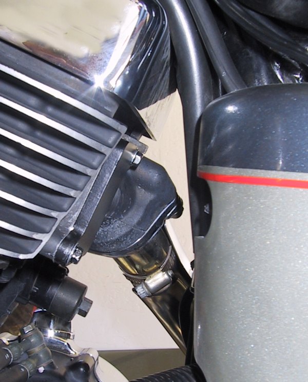 1500 owners. Trace that vacuum hose back to your carb or throttle body and remove it. With FI bikes you'll really need those long nosed pliers now to reach the little tiny hose clamp tucked down between other plumbing. With that free use the pliers to pull the hose off the throttle body. Put a vacuum cap (supplied with the Barons kit) on the opening where the hose was.