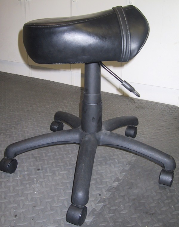 Every office throws out a chair now and then. If you can snag one with torn upholstery chances are the wheels and even the hydraulic mechanism will still be in good order. Cost? FREEBIE! If not then head for a charity store (Disabled Veterans, Salvation Army) and find one for next to nothing. Remove the seat pad and throw it away. Disassemble the rest of the chair (note the bearings at the base of the hydraulic tube) so you aren't forced to work around the legs while drilling holes in the base. If you're lucky as I was you'll be able to drill a couple of new holes in the base plate and use the seats original studs in front.