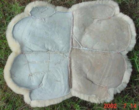 Scott says he and his wife used several Wal-Mart Sheepskin wash mitts (about $60 worth) to make this beauty. The skins were oriented so all the 'grain' goes the same direction. Scott says people don't know that it is not all one piece.