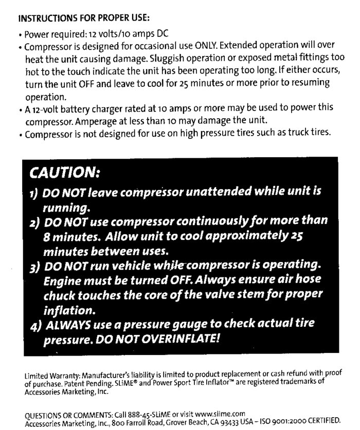 Next item in the instructions note the compressor should never be operated more than 8 minutes to prevent excessive heat buildup and possible destruction to the inflator (not to mention additional global warming and terrible guilt on your part). So the next obvious question to be answered. Can this little compressor actually fill a large motorcycle tire (mine are 150-80-16) in eight minutes or less or will you have to wait through a 20 minute cool down then start again? Let's find out.
