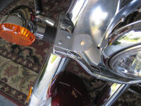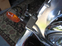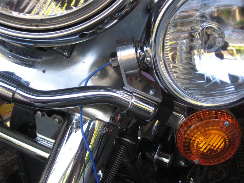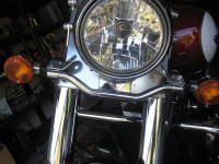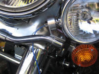 Many Vulcan Classic riders have seen the Kirk's No Lightbar solution for the Nomad and wished they could do the same with their Vulcan Classic. The problem has been with the one-inch narrower fork on the Classic that made it impossible unless the owner went with a smaller than standard housing. TallAnnie to the rescue! She has created a very simple bracket that allows mounting spot/fog lights on the Classic avoiding the expense of a commercial lightbar.