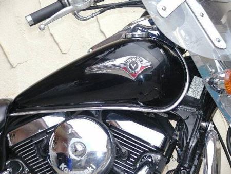 This is one of those great aftermarket tips that has been used for years on motorcycle gas tanks with a flange around the bottom (the Vulcan 4.3 gallon tank) to add a bit of flair. John Arsenault expanded on the theme, adding trim to his Vulcan's front and rear fender too. You can see the classy results above.