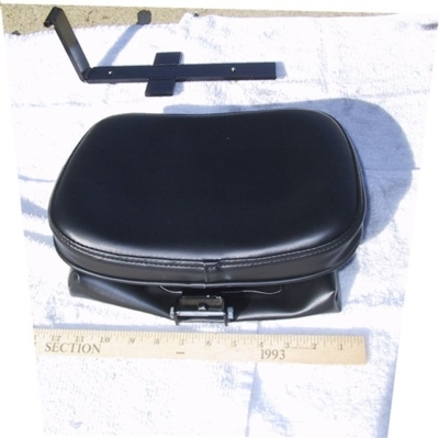 1. Remove drivers seat (10mm bolts on each side) 2. Remove pillion pad (single 10mm bolt at front then slide forward) 3. Remove the pointy bracket from bottom of pillion pan (2 10mm nuts) and strap 4. Remove all the staples from the cover with a combination of small screwdriver and pliers (a staple remover 'might' work) 5. Carefully pull cover off foam pad and set aside 6. Remove foam pad from plastic pan (it isn't glued but it might be a little stuck) set aside 7. Set bracket that comes with backrest atop pan and mark holes to be drilled for 2 bolts (note, if you have a very long reach and always found other backrests pushed you too far forward you might want to bolt the bracket onto the pan 1/2 to 3/4 inch further back than where the photo (below) shows. The backrest has a huge forward adjustment but nothing to the rear from vertical) 8. Bolt on bracket 9. Replace foam, carving carefully with a serrated knife (the one you use for turkey does a great job) at the front to obtain clearance for the vertical portion of bracket (note, if you get carried away with the knife you can always put pieces of cut foam back but you really don't need the hassle) 10. With foam pad in place, replace cover (do not cut any holes yet) 11. With cover in place, carefully feel for the top of the bracket and make a slit in the cover there. Make the smallest slit you can and still get the bracket through the hole. DO NOT cut where the seat cover threads are. 12. Staple the cover back on the pan. Utopia recommends an electric stapler but I found the manual type gun worked just fine. (not a desk stapler) 13. Put the pointy bracket back on the pillion (your choice whether to use the strap or not but most riders junk them) and mount the assembly on the bike. 14. Look in the pouch on the backrest and you'll find instructions on how to secure it along with an allen wrench and a black plastic thing with a slot in it. 15. Place the black plastic thing over the backrest bracket on the seat and form it to fit. Once formed, pull the protective paper off the double sided tape and stick it in place. This prevents the seat material from tearing and provides a bearing surface for the swivel part of the bracket. 16. Mount the backrest to the bracket. You'll have to tighten the nut and bolt a little to prevent it from flopping forward on its own but not so tight that you can't easily fold it forward when you want to. 17. Note the backrest adjustment, a silver cap nut with a nut on it. Loosen the nut, sit on the bike and estimate where the fore/aft and vertical adjustments are most comfortable. You can either use that nut as a locknut to prevent the adjustment from changing or leave it at the bottom of the bolt. 18. Taking a 7/16" wrench and the supplied allen wrench with you, go for a ride and make your backrest adjustments when you can stop safely. You'll need the allen wrench to move it up or down. There is a 1" range of adjustment vertically.