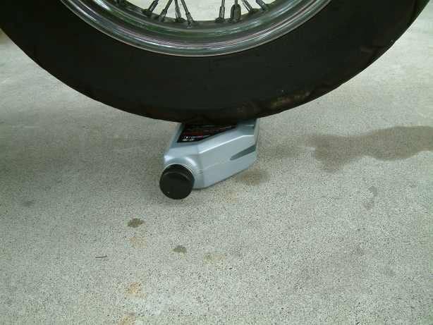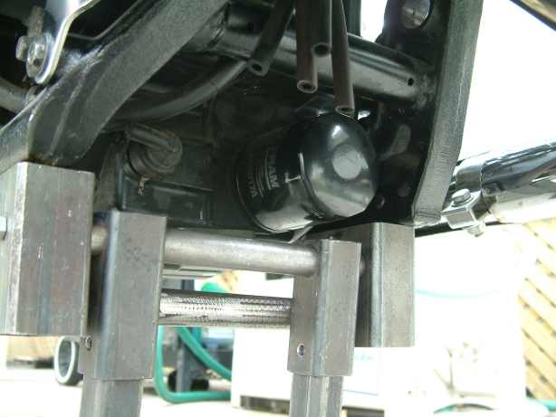 2. If you'll be changing oil, put a drain pan under your oil filter and remove/replace the filter before attaching the V-Lift. You can do this with the bike on the lift but you'll have oil dribbling down all over the lift (just like it does on a big hydraulic bike lift) and you'll have a mess to clean up. It's much simpler just to change the oil filter with the bike on its side stand then use your choice of drains to get oil out of the crankcase with the bike up on the V-Lift.