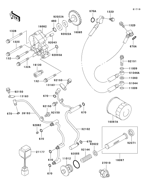 What is it and where is it? Check the diagram below (courtesy of Kawasaki) which shows part number 16097 (bottom right in the box). That's the screen which 'pre' filters oil before it reaches the oil pump and spin on filter. It's also the best oil drain you have with the opening sitting lower than the normal oil drain plug in the center of your crankcase.