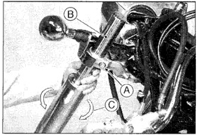 Remove the top (chrome) nut, washer and "O" ring from the triple clamp and loosen