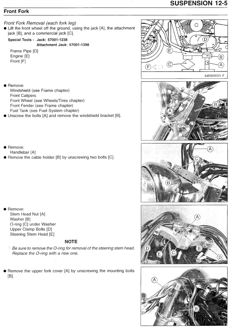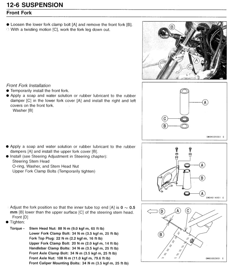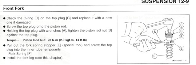 In the event you're wondering if this is worth doing yourself consider Kawasaki's book rate for this job is 3.5 hours. Your shops rates may be higher or lower but where I live it's $70 an hour so this is a $245 job plus fork oil if the Kawasaki shop does it. Now, do you think an afternoon of your time is worth it? Read on and PLEASE read through the entire page before you start disassembling things just to be sure you have the necessary parts and supplies.