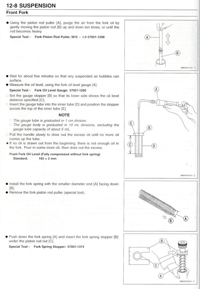 13. The book calls for the fork oil level to be 165 mm from the top of the tube (without the spring in place) so lower your aquarium tubing into the fork tube to the line you must made. Suck (lightly) on the other end of the tube (or use a syringe) to remove any excess oil. If you're only getting air, add some oil. When the oil stops and you're making those 'soda fountain with the straw' noises with your tube it's time to stop. Do the same with the other fork.