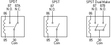 Above are some common types of relays. For a single set of lights you'll probably used the SPST but look at the others which can provide some lighting options. Note the SPDT can run one accessory when the switch is off (87A) and another (87) when the switch is on. The SPST Dual Make will run two separate accessories (87 & 87B) when you turn on the switch