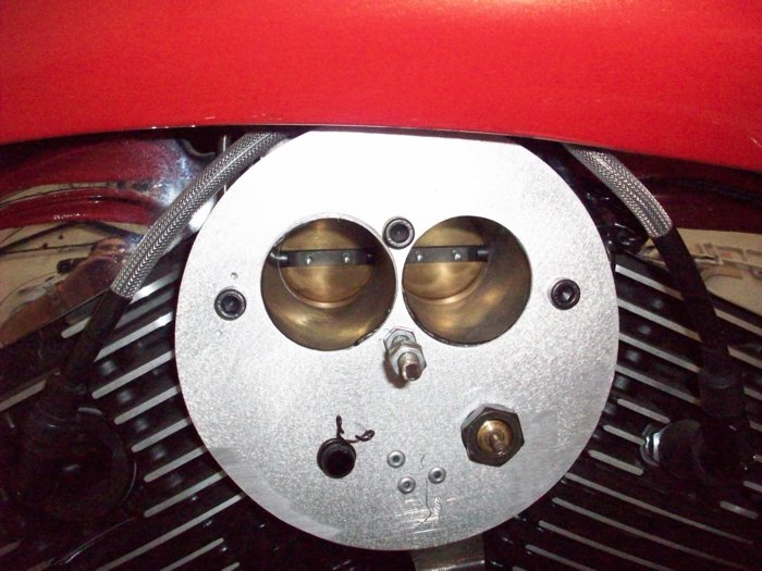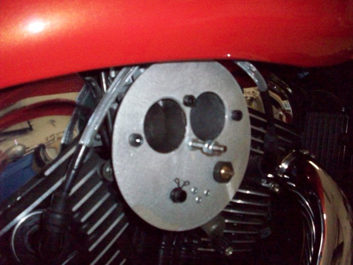 Notice the air temperature sensor and crankcase vent hose also have appropriate size holes drilled. The rivets shown are holding the idle adjustment cable bracket (removed from the OEM backing plate).